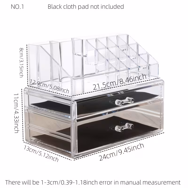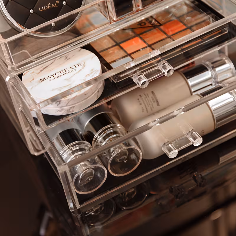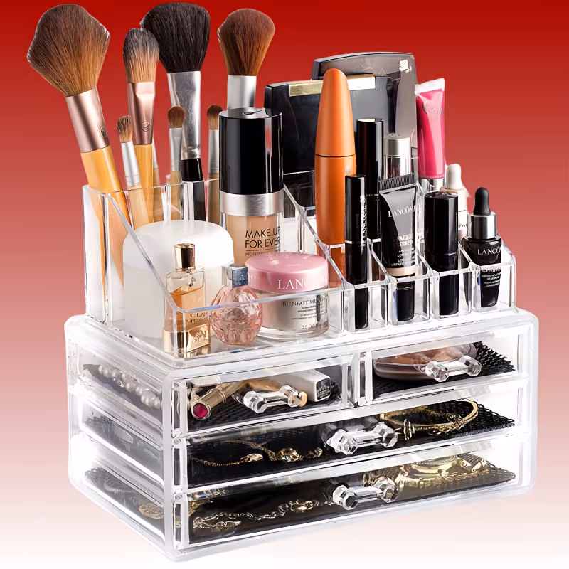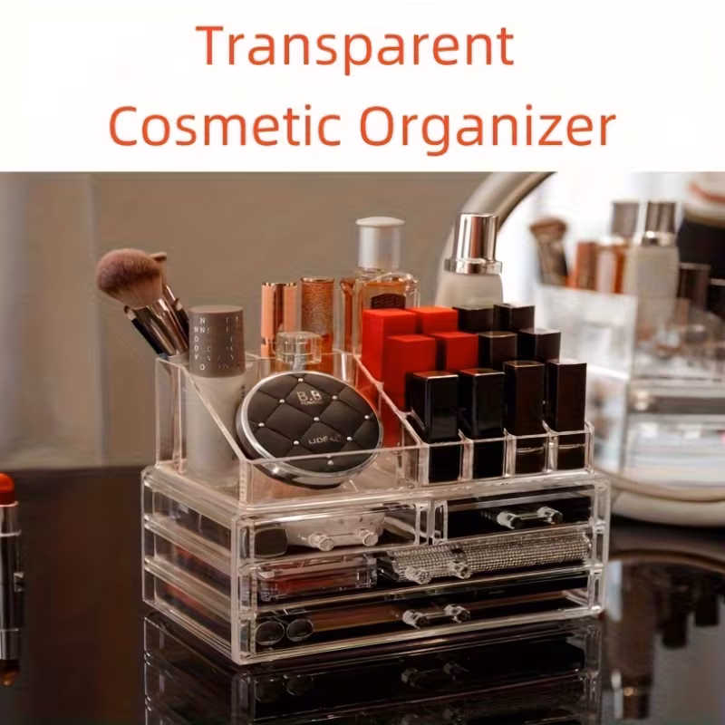 Eleganter Kosmetik- und Schmuckaufbewahrungs-Lösung für das Badezimmer, Arbeitsplatte, perfekt für Kosmetikprodukte und Zubehör, Make-up-Pinselhalter. Transparenter Kunststoff mit Schubladen.